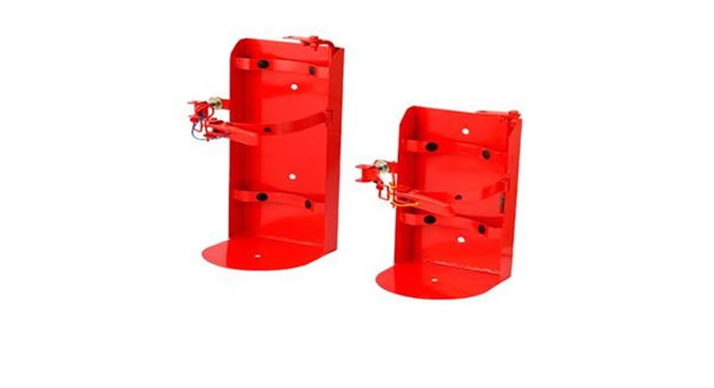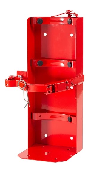 Fabricado en pletina con base redonda para extintor y cierre manual que incluye aldaba para candado.